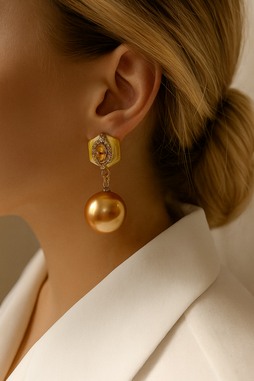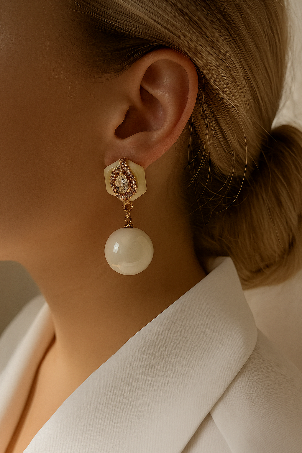 Discover timeless beauty with the Nehyr Elegant Pearl Drop Earrings. Crafted with precision, these earrings feature a stunning hexagonal base encrusted with a delicate shimmering crystals. The design is completed with a glossy pastel bead drop, creating the perfect balance of charm and sophistication.
