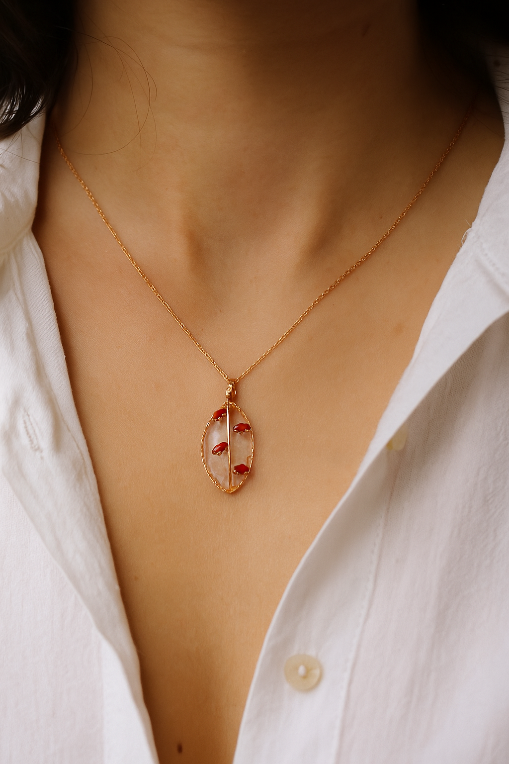 Leaf-inspired pendant with red crystal detailing