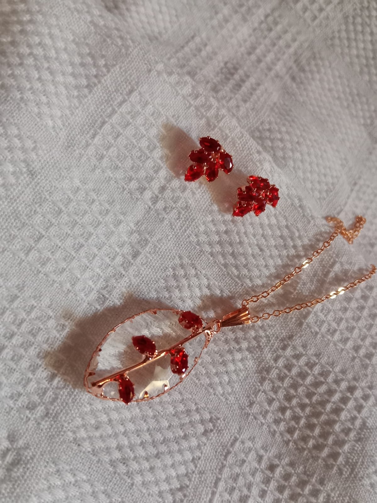 The Nehyr Red Crystal Leaf Necklace & Earrings Set is designed for those who love timeless elegance. This jewelry set features a delicate gold-toned chain with a transparent leaf-shaped pendant, beautifully adorned with vibrant red crystals. Paired with matching red crystal stud earrings, it’s the ideal accessory for both everyday wear and special occasions.