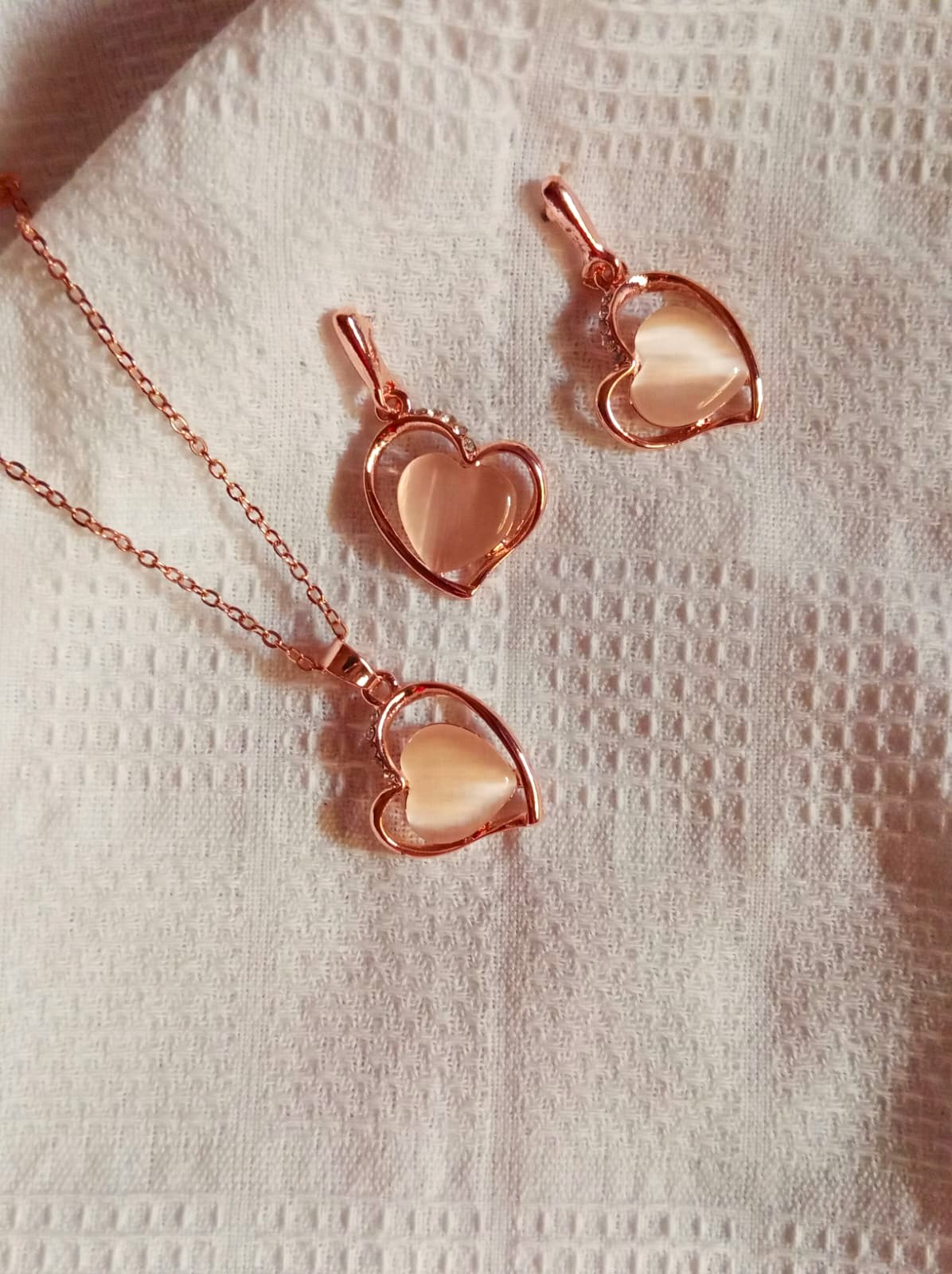 Celebrate love and elegance with the Nehyr Rose Gold Heart Jewelry Set. This stunning set includes a delicate necklace with a heart-shaped pendant and matching earrings, each adorned with a polished pink cabochon stone at the center. The rose gold plated frame enhances the soft pink tones, creating a feminine and timeless design.